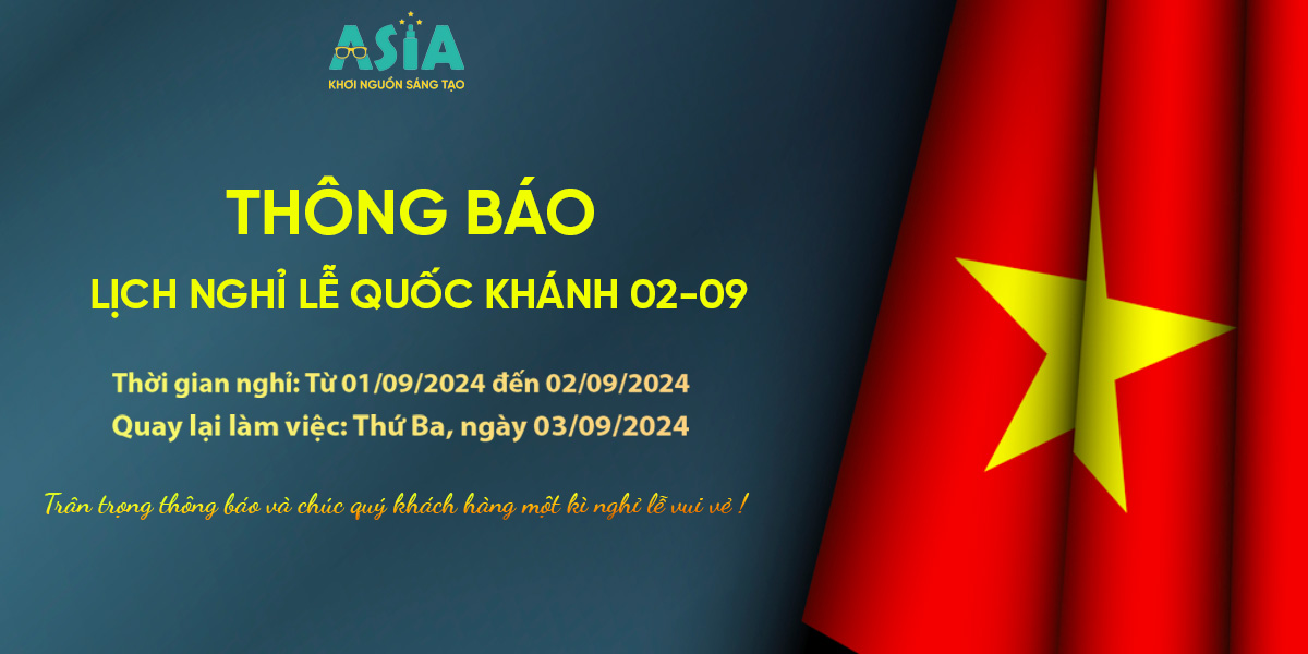 Năm nay chào mừng 79 năm ngày Quốc Khánh nước Cộng hòa xã hội chủ nghĩa Việt Nam, hoà trong không khí hân hoan ngày Quốc Khánh cùng toàn thể nhân dân cả nước. Asia áp dụng chính sách nghỉ theo yêu cầu nhằm tăng thời gian nghỉ ngơi của công nhân viên trong công ty, lịch nghỉ lễ mùng 02/09 được Asia áp dụng từ ngày : 01/09/2024 đến hết ngày 02/09/2024.